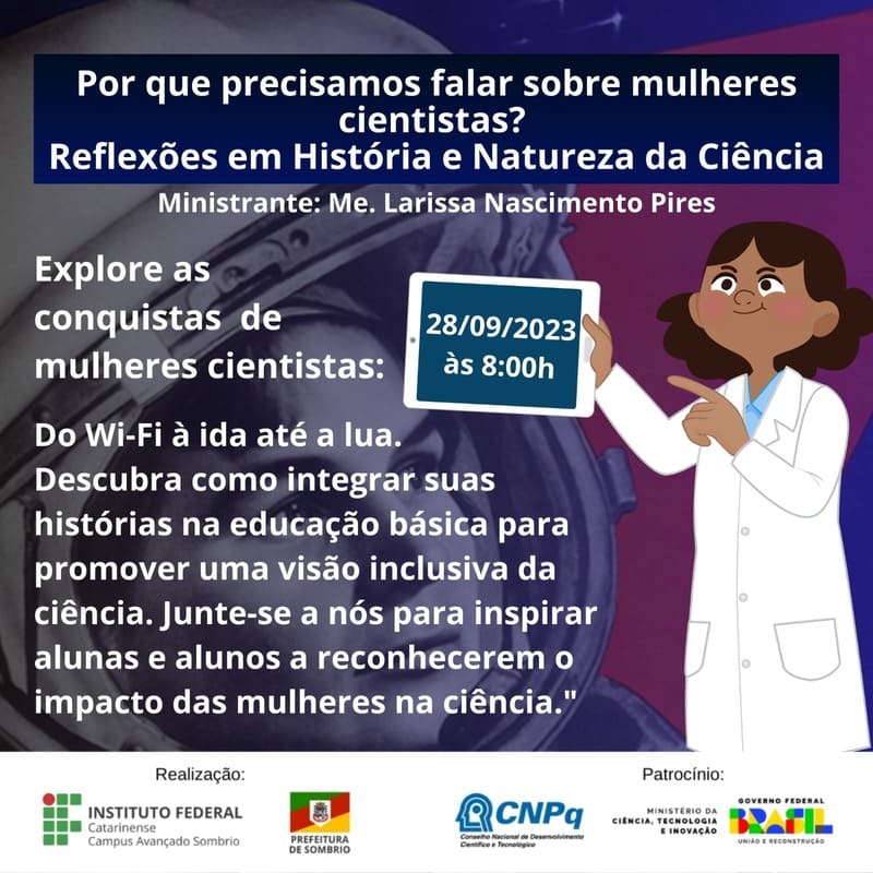 Quem desenvolveu os princípios do Wi-Fi e do Bluetooth? Quem possibilitou o surgimento de tratamentos de radioterapia? Quem elaborou o primeiro algoritmo de computador e tantas outras perguntas poderão ser respondidas na oficina Por que precisamos falar sobre mulheres cientistas? Reflexões em História e Natureza da Ciência.
