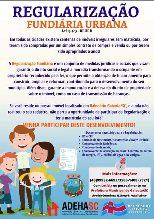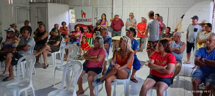 Nos dias 5, 6 e 7 de janeiro, a equipe da Associação para o Desenvolvimento Habitacional Sustentável, ADEHASC, promoveu um mutirão nas praias onde os imóveis não são regularizados. Além de estender o convite de casa em casa, a equipe coordenada pelo presidente da associação, Djalma Morell e Rúbia da Silva, se reuniram com os moradores nas comunidades. Os encontros iniciaram na sexta-feira, 5, na comunidade de Lagoa de Fora, com abrangência à Rua Nova e Lagoa de Fora. No dia 6 a reunião com moradores foi no salão comunitário do bairro Fernão Capelo e no dia 7, na Praia Sulmar, com abrangência para o bairro Jardim Ultramar. O encontro ocorreu no salão da comunidade Sulmar.