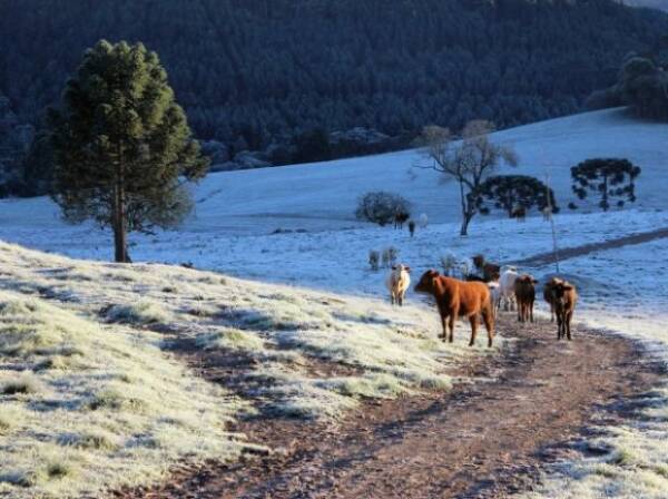 A geada branca, que congela a parte superficial das plantas, é observada com frequência em diversas regiões de Santa Catarina durante as estações mais frias. Ela se forma associada a temperatura baixa, ausência de nuvens e baixa umidade do ar. “Quando a temperatura do solo cai acentuadamente no período noturno, aproximando-se de 0°C, as gotas de orvalho congelam, formando o fenômeno”, explica Gilsânia. Nesse caso, a temperatura do ar não precisa chegar a 0°C: abaixo de 4°C já pode ocorrer formação de geada, mas, quanto menor for a temperatura, mais intenso será o fenômeno.