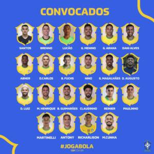 Assim, os 22 jogadores que defenderão o Brasil no Japão são: Santos (Athletico-PR), Brenno (Grêmio), Lucão (Vasco), Daniel Alves (São Paulo), Gabriel Menino (Palmeiras), Guilherme Arana (Atlético-MG), Abner (Athletico-PR), Gabriel Magalhães (Arsenal), Nino (Fluminense), Diego Carlos (Sevilla), Bruno Fuchs (CSKA), Douglas Luiz (Aston Villa), Bruno Guimarães (Lyon), Douglas Augusto (PAOK), Claudinho (Red Bull Bragantino), Matheus Henrique (Grêmio), Reinier (Borussia Dortmund), Matheus Cunha (Hertha Berlim), Martinelli (Arsenal), Antony (Ajax), Paulinho (Bayer Leverkusen) e Richarlison (Everton).
