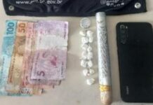 Com a situação de flagrante, as equipes cercaram o local. Um dos suspeitos tentou fugir pulando um muro, mas foi detido com 5g de crack, R$ 332 e um celular. Pelo trajeto, os policiais localizaram ainda uma máquina de cartão e outro celular.