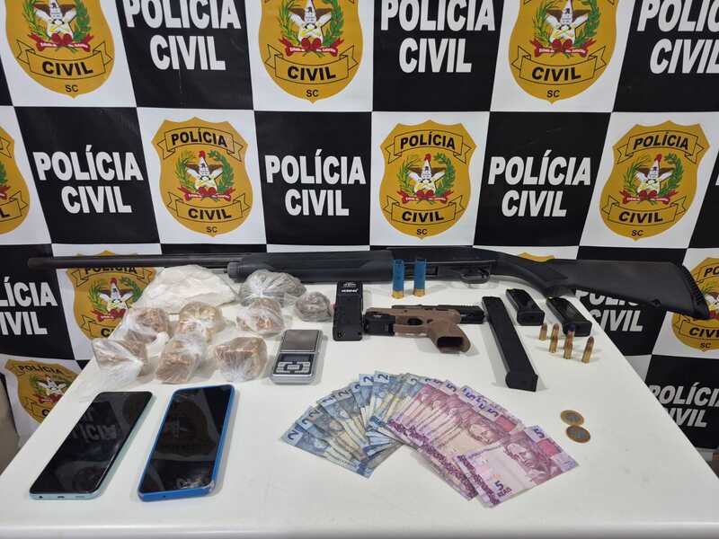 Uma operação da Polícia Civil resultou na apreensão de uma grande quantidade de drogas, armas de fogo e munições na tarde desta sexta-feira (9), em Balneário Arroio do Silva, no Litoral Sul de Santa Catarina. A ação foi coordenada pela 1ª Delegacia de Polícia de Araranguá e pela Delegacia de Polícia do município, com apoio de policiais que atuam na Operação Veraneio.