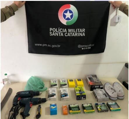Os policiais militares iniciaram o acompanhamento do veículo, que foi abordado no bairro Guarita, em Sombrio. No automóvel foram encontrados vários objetos, eletrônicos e de beleza, todos, conforme os autores, provenientes de furtos em vários comércios em Araranguá e Sombrio.