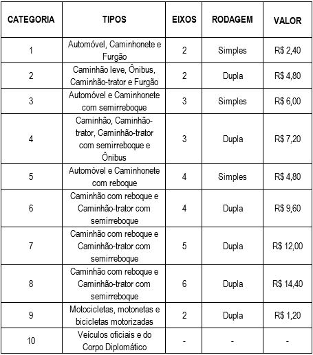 Veja abaixo a tabela com as novas tarifas a serem praticadas nas praças de pedágio da CCR ViaCosteira: