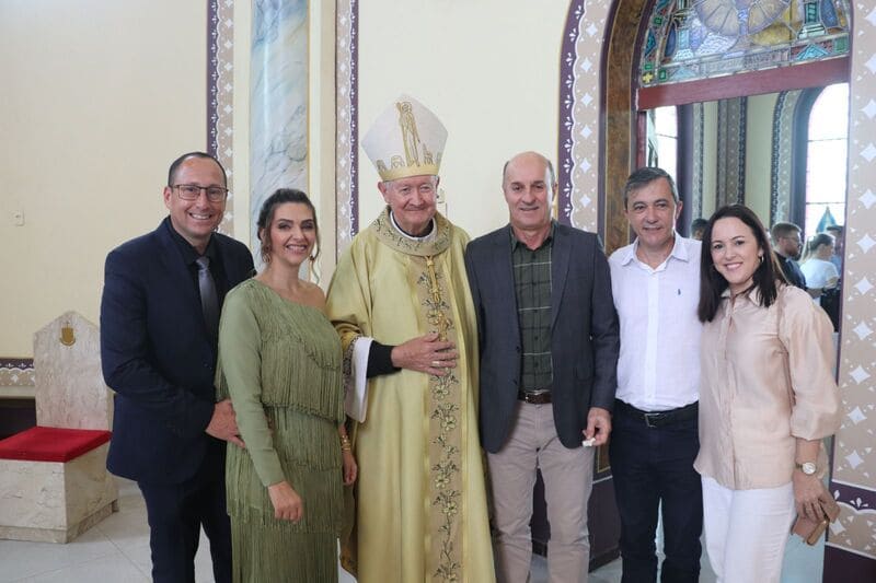 Durante a festa, José Eraldo foi fotografado ao lado do bispo da diocese de Criciúma, Jacinto Inácio Flach, do deputado Zé Milton e do presidente do PSD, Teco Silvério.