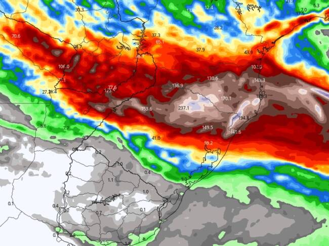 ►Previsão chuvas fortes e volumosas a partir do domingo, segunda, terça e quarta-feira (02 a 04/05) com acumulados que podem passar dos 150/200 mm proporcionado pontuais alagamentos, deslizamentos de terra e enxurradas com destaque para as cidades do Oeste, Meio Oeste, Serra, Grande Florianópolis e Litoral Sul no estado de SC e Norte do RS.