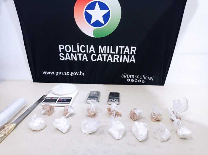 Em buscas pelo imóvel, foram encontradas porções de crack e cocaína, três balanças de precisão, um rolo plástico e uma faca com resquícios de maconha.