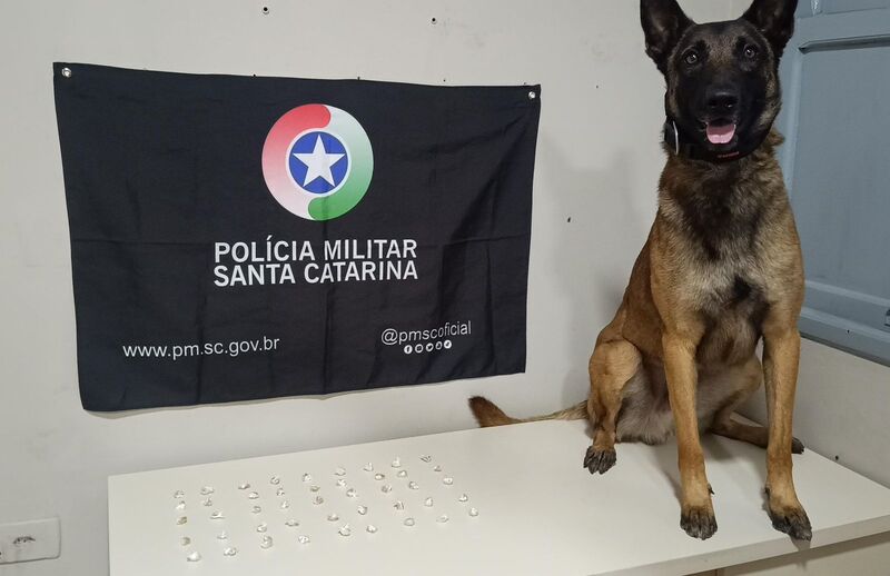 Por volta da 1h, durante patrulhamento na rua Fulvio Furtado, no bairro Divineia, os policiais do canil setorial do 19º Batalhão de Polícia Militar (BPM) utilizaram o cão de faro Argo para auxiliar nas buscas em um lote desabitado. O cão indicou dois pontos específicos, onde foram localizados cinco malotes, cada um contendo nove porções de crack, totalizando 44,9 gramas do entorpecente.