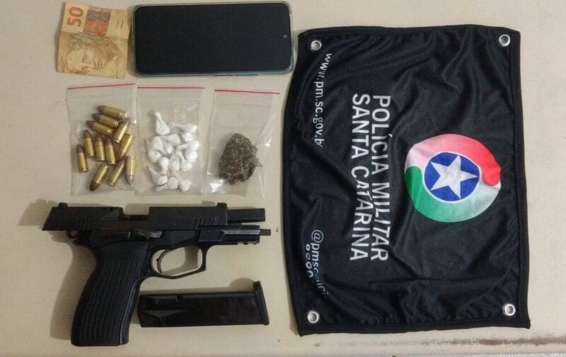 Na madrugada deste domingo, dia 22, na Vila Catarina, em São João do Sul, por volta da 1 hora, a Polícia Militar prendeu um homem por tráfico de drogas e apreendeu drogas, arma e munições.