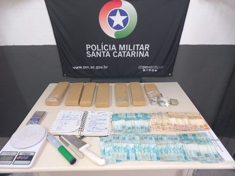 Foram apreendidos ainda três balanças de precisão, R$ 6 mil, caderno de anotações referentes ao tráfico e facas com resquícios de maconha.