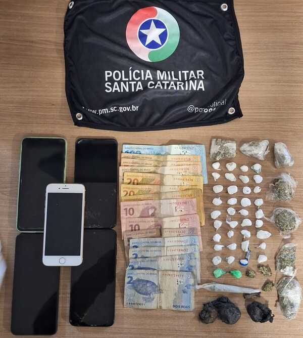 Com os indivíduos foram encontrados grande quantidade de drogas. Com o apoio do Canil da PM de Araranguá, foi encontrado ainda no pátio da residência mais drogas preparadas para o comércio.
