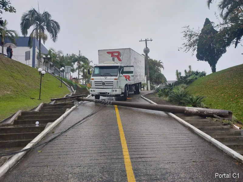 De acordo com a PM, o motorista do caminhão VW/13.180 estava saindo do estacionamento do colégio quando o baú engatou na fiação da rede elétrica, momento em que um dos postes caiu e acabou puxando outros três.