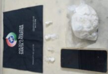 A PM foi acionada enquanto o assalto estava em andamento e uma guarnição do PPT, o Pelotão de Patrulhamento Tático, localizou a motocicleta e o simulacro de arma de fogo abandonados. Os policiais tinham informações de que um veículo escuro deu fuga à dupla e localizaram o automóvel em uma casa, no bairro Coloninha, próximo ao local onde a moto foi encontrada.
