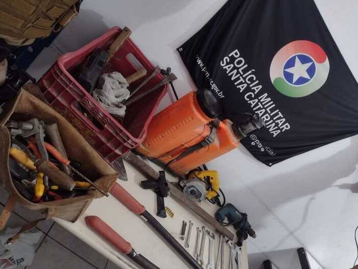 Foram apreendidos um corta frio; uma furadeira Makita; uma serra Dewalt; uma bomba de veneno; um jogo de chaves de boca; uma caixa com ferramentas diversas; e uma bolsa de couro, com outras ferramentas.