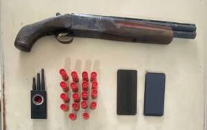 Em seguida, os suspeitos foram localizados pelos policiais e por meio da busca pessoal, uma sacola contendo 18 munições de calibre 12 foi localizada na posse de um deles, e com o outro suspeito, uma bolsa contendo uma arma longa tipo espingarda, calibre 12.