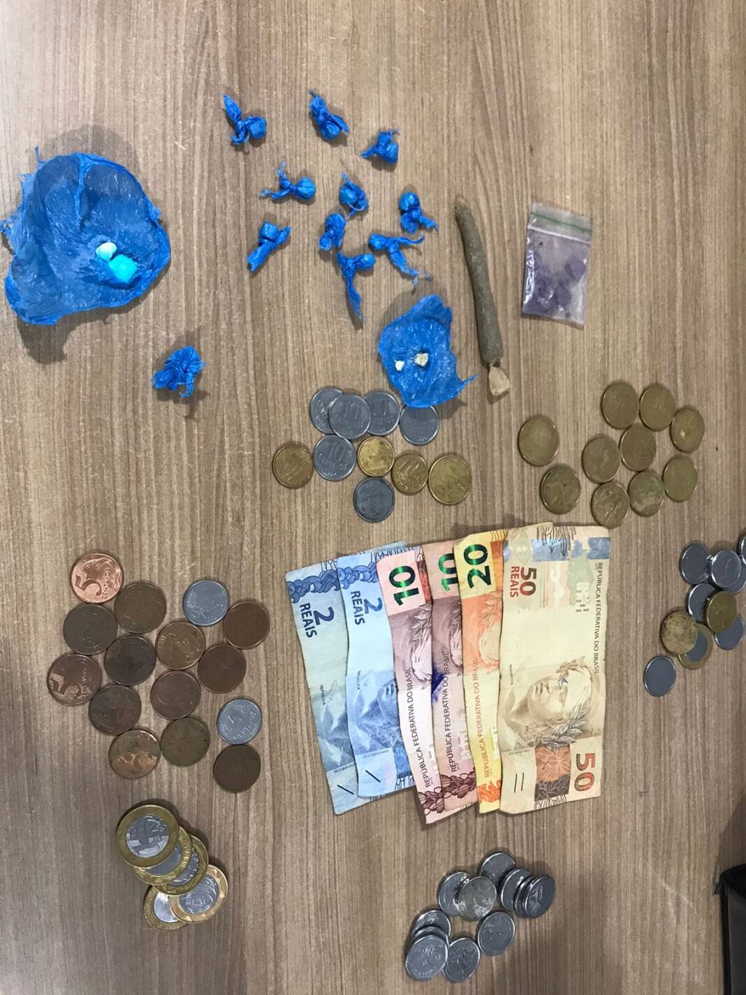 Como o porta-malas estava aberto, foi possível abrir as outras portas e buscas foram realizadas. Foram encontradas 13 buchas de cocaína, um cigarro de maconha, cinco comprimidos de ecstasy, uma CNH e R$ 113,40.