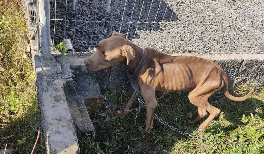 Os policiais se dirigiram até um loteamento no município e encontraram uma cachorra aparentemente da raça pitbull com três filhotes. A cachorra estava muito magra com ferimentos pelo corpo e sem alimentação, além de estar amarrada por uma corrente.