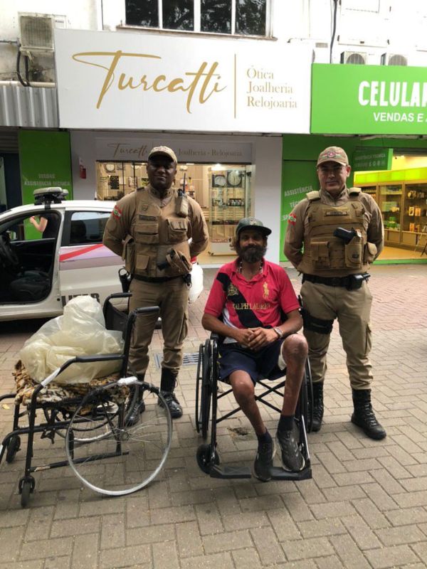 Na tarde desta terça-feira, no Centro de Criciúma, uma guarnição da Polícia Militar, composta pelos sargentos Alexandre e Serafim, realizou uma surpresa a Elias Pedro, que recebeu de presente uma cadeira de rodas nova.