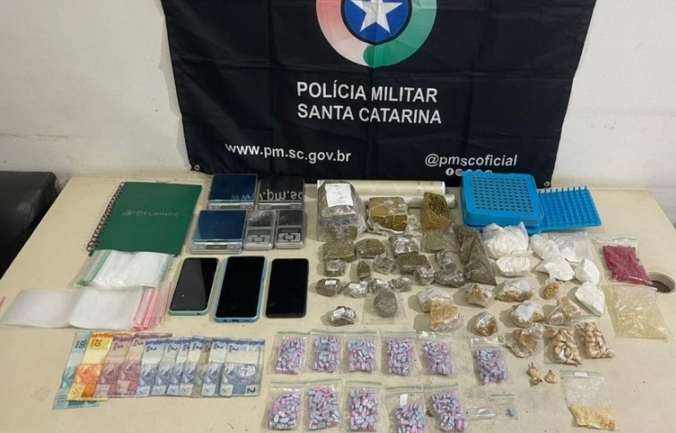 Diante disso, foi realizada busca no interior do imóvel, onde foi localizada grande quantidade de drogas, incluindo cocaína, maconha, crack e ecstasy, todas fracionadas e prontas para a comercialização. No local também foram apreendidas cinco balanças de precisão, rolos de insulfilm, uma sacola com diversos pacotes plásticos utilizados para embalar os entorpecentes, dois pacotes de cápsulas vazias, um encapsulador manual, além de R$ 144,00 em dinheiro em notas fracionadas e três aparelhos celulares.