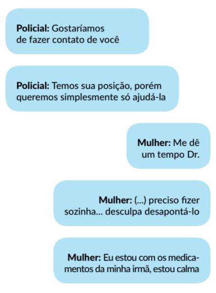 Uma mulher havia procurado a CPP, contando que a irmã tinha ingerido vários medicamentos e tinha sido levada ao hospital. Quando foi liberada, a irmã a levou para a sua casa, para cuidar dela. Porém, pouco depois a mulher desapareceu, levando mais medicamentos e uma garrafa d’água. Com medo do que ela pudesse fazer, a irmã foi à Delegacia, acompanhada pelo cunhado. Eles disseram que a mulher tinha levado o celular e aparecia com o status ‘online’, mas assim que eles enviaram mensagens pelo WhatsApp, ela os bloqueou.