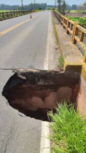 Na manhã desta quarta-feira, a Defesa Civil esteve na SC-290 que liga São João do Sul até a cidade de Praia Grande para averiguar uma cratera que cedeu na ponte do Rio Canoa.