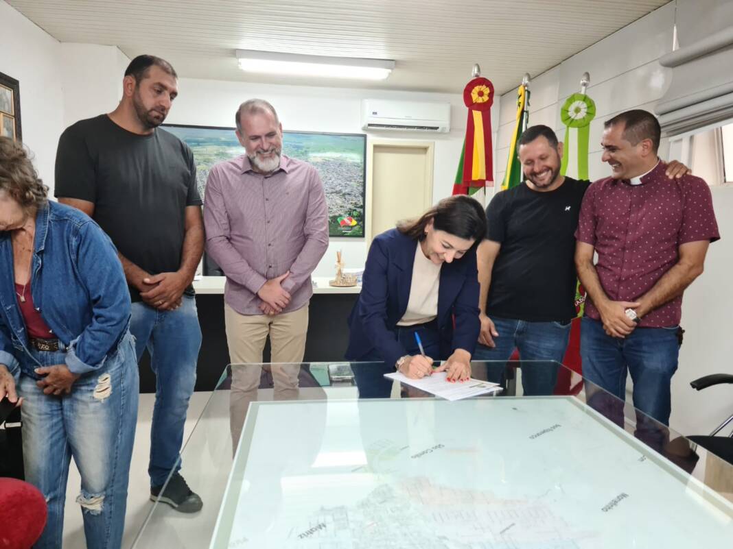 A ordem de serviço foi assinada pela prefeita Gislaine Cunha na manhã desta quarta-feira, dia 6, no gabinete, em ato realizado com a presença de moradores da comunidade, do vereador Adriano Magrão, que também é presidente do Caep local, do engenheiro Renato Bristot e dos secretários de Administração e Finanças, Márcio Abatti e Agricultura, Jonas D’Ávila.