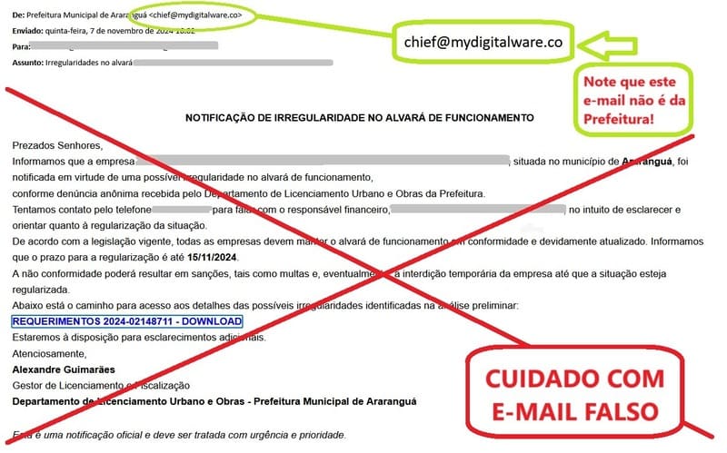 A Administração Municipal de Araranguá emitiu um alerta aos contribuintes sobre o envio de e-mails fraudulentos que simulam comunicações oficiais da fiscalização de tributos. A prefeitura informa que esses e-mails estão sendo enviados com aparência de mensagem oficial e têm como objetivo induzir o contribuinte ao erro.