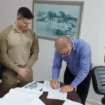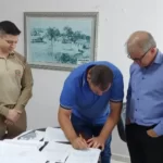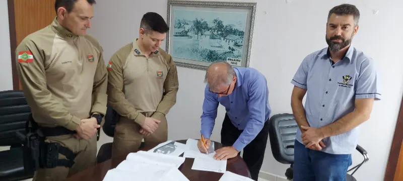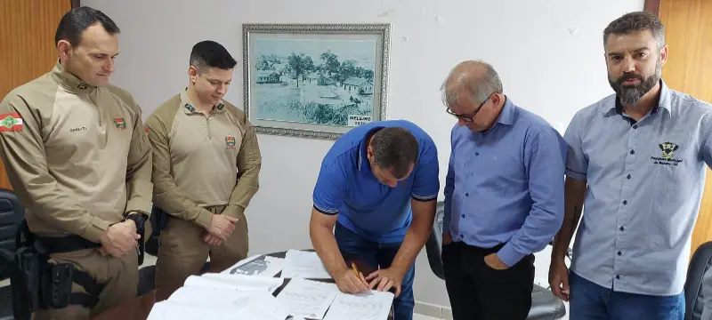 Mais um importante passo foi dado pela Administração Municipal de Meleiro para a consolidação de uma área que contará com todos os serviços de segurança para o cidadão meleirense. Na tarde de segunda-feira, 24 de abril, o Prefeito Eder Mattos recebeu em seu gabinete o Ten Cel Marcelo Bertoncini Zanette, comandante do 19º Batalhão de Polícia Militar, Cap André Araújo, comandante da 3ª Cia PM, 1° Sgt Cristiano Guizzo e o representante da construtora Supreme, senhor Rafael. Na oportunidade as autoridades assinaram a Ordem de Serviço que autoriza o início das obras da Central Municipal de Segurança, com 190,93 metros quadrados de área construída e que vai abrigar o serviço de videomonitoramento de câmeras e o Grupamento de Polícia Militar de Meleiro. Participaram do ato, o secretário de Administração e Finanças, Júlio Cesar de Oliveira e os engenheiros da Prefeitura, Ivan Olivo e João Francisco Nazário, que desenvolveram o projeto técnico da obra.