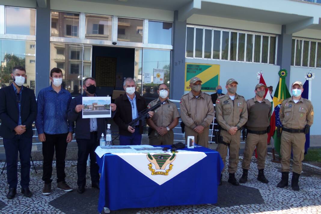 Um grande passo para o fortalecimento da segurança pública do povo de Meleiro foi dado na última sexta-feira, dia 9, com a entrega de um veículo Renault Duster zero km, transformado e adaptado para viatura militar, um fuzil T4 556 para equipar os policiais militares, que atuam no município, um Smartphone para serviços operacionais e o mais importante de todos os bens anunciados: um terreno, medindo 1.637 m², para ser construído a sede do comando da Polícia Militar em Meleiro. Para que o sonho da construção se torne uma realidade, a Prefeitura Municipal já conta com projeto de engenharia.