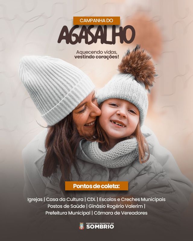 Com a chegada do inverno, a Prefeitura Municipal de Sombrio está lançando a campanha do agasalho “Aquecendo Vidas, Vestindo Corações”. A iniciativa visa arrecadar agasalhos e cobertores em bom estado para doação a pessoas em situação de vulnerabilidade social.