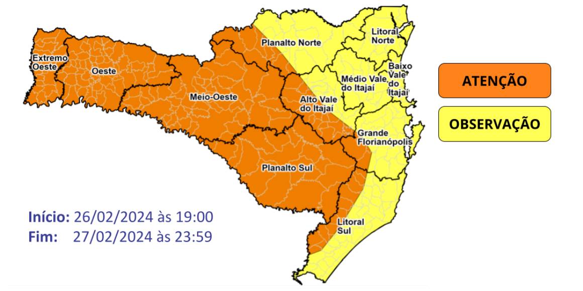 A partir da tarde desta segunda-feira (26), a aproximação de uma frente fria combinada com uma área de baixa pressão favorece a ocorrência de temporais isolados em Santa Catarina. Entre a noite de segunda e madrugada de terça-feira (27), os temporais ganham força e vêm acompanhados de chuva intensa em curto período de tempo, raios, rajadas de vento e eventual queda de granizo, principalmente entre o Grande Oeste e parte dos planaltos.