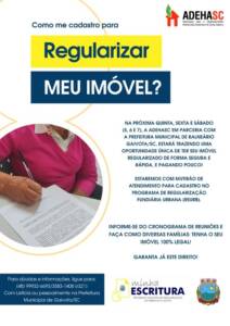 A Administração de Balneário Gaivota, em parceria com a ADEHASC, promove, a partir desta quinta-feira, 05, encontros com os moradores de bairros que ainda não possuem a escritura do seu imóvel. O objetivo do mutirão, é oportunizar para que os veranistas e nativos se cadastrem no Programa Municipal de Regulação Fundiária “Minha Escritura”. Através do REURB a tão sonhada escritura pode ser conquistada e irá destravar a vida de muitas famílias. A Coordenadora da ADEHASC, Rúbia da Silva, Prefeito Kekinha, Vice, Jonatã e assessores estarão presentes aos encontros.