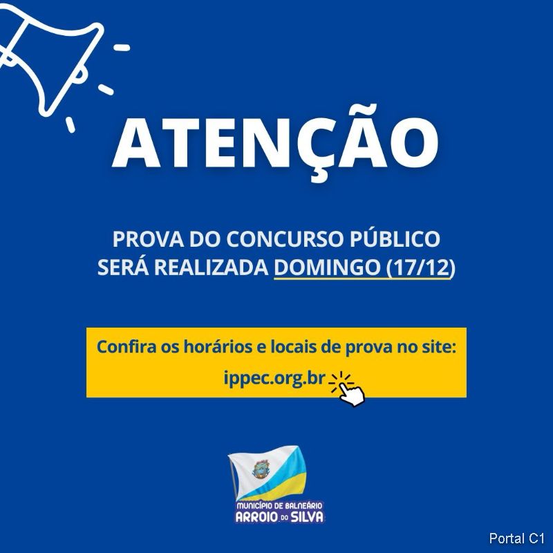 Será realizada no domingo (17/12) a prova do Concurso Público da Prefeitura de Balneário Arroio do Silva. A prova será realizada na cidade de Araranguá, nas escolas Maria Garcia Pessi, Castro Alves e Bernardino Sena Campos. Os candidatos inscritos precisam ficar atentos e conferir o local e o horário da prova no site: https://ippec.org.br/concursos/concurso/259.