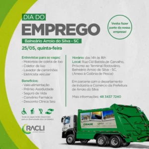 A empresa Racli Limpeza Urbana estará em Balneário Arroio do Silva na quinta-feira (25) para realizar entrevistas para preenchimento de vagas em aberto. Há vagas para: motorista de coleta de lixo; coletor de lixo, lavador de caminhões; e eletricista veicular.
