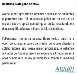Os fortes ventos na manhã desta quinta-feira, dia 13, causaram a destruição de parte do telhado do Supermercado Althoff, localizado no Centro de Imbituba. Pessoas que estavam no local filmaram o momento em que o telhado se desprende do teto, causando medo aos clientes que estavam no estabelecimento.