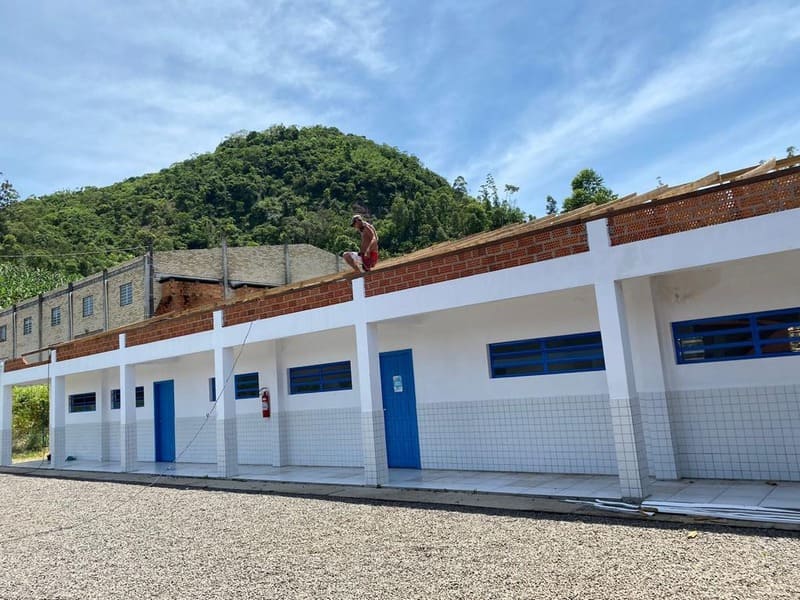 Uma das estruturas atingidas pelo forte vendaval registrado no início do mês de novembro no extremo sul catarinense, a escola municipal de ensino básico Albino Zanatta, de Jacinto Machado, está recebendo obras de recuperação. Parte de seu telhado foi arrancado, deixando algumas salas isoladas por conta dos estragos.