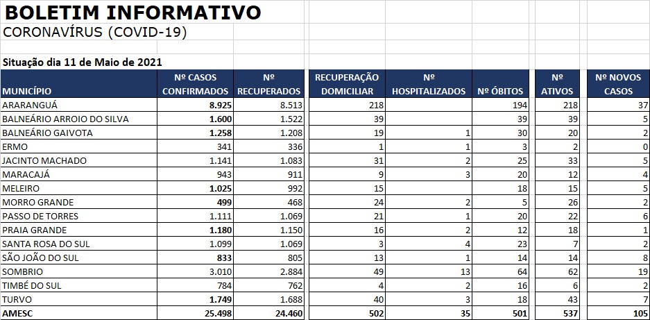 Ainda, na região, segundo boletim da Amesc desta terça, 25.498 pessoas já foram contaminadas pelo novo coronavírus desde início da pandemia e 24.460 estão recuperadas. Atualmente a região tem 537 pessoas com o vírus ativo.