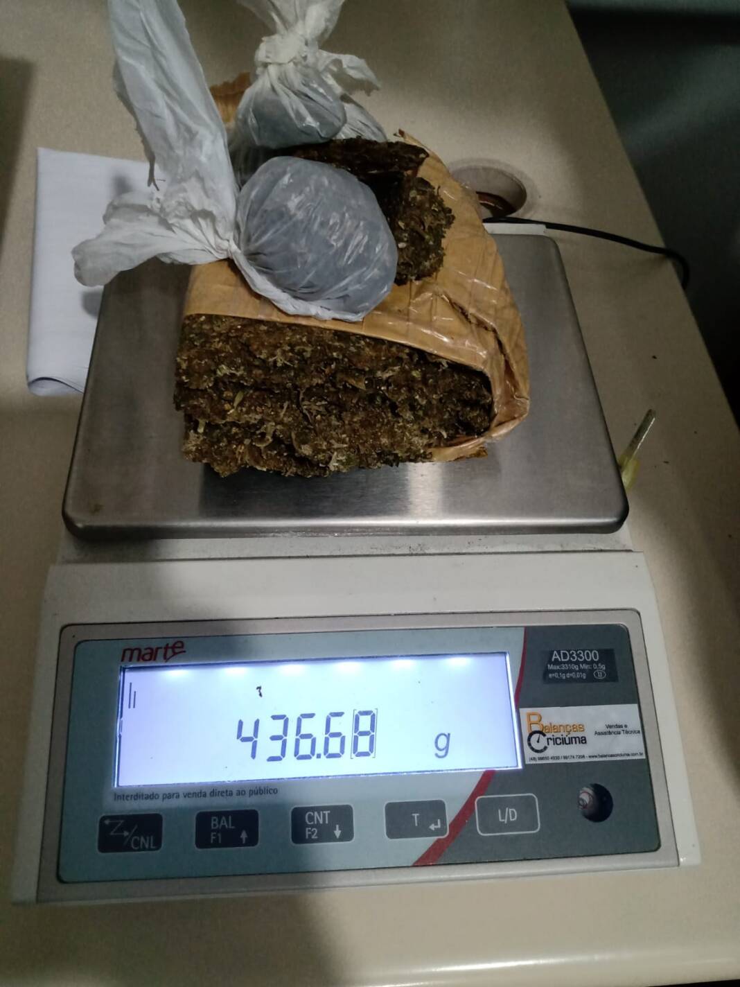 Ele negou ter mais drogas em casa, porém, após serem autorizados pelos pais do rapaz, os PMs fizeram buscas e encontraram no quarto, sobre o sofá, entre algumas roupas, uma sacola com grande porção de maconha e balança de precisão, pesando 43 gramas.