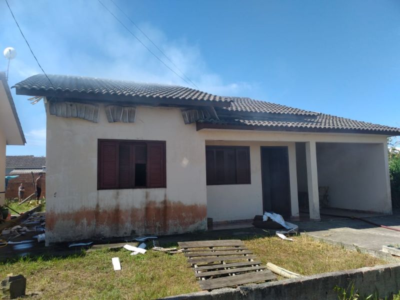 Uma residência ficou parcialmente destruída após pegar fogo, na tarde deste domingo (19), por volta das 13h30, no bairro Santa Helena, em Balneário Arroio do Silva.
