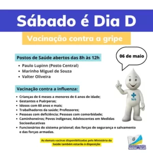 Os Postos de Saúde do município de Balneário Arroio do Silva estarão abertos neste próximo sábado (06) das 8h às 12h para vacinação contra a gripe. As demais vacinas disponibilizadas pelo Ministério da Saúde também estarão à disposição. As unidades que estarão abertas são: Paulo Lupinn (Central); Marinho Miguel de Souza (Erechim) e Valter Oliveira.