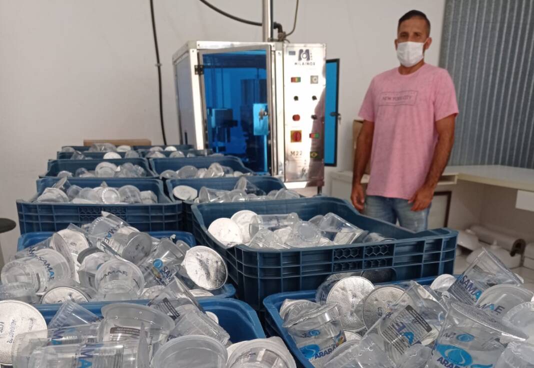 Os responsáveis pelo envasamento, Filippe Hilário Borges e Paulo Cesar dos Anjos Gomes, o Paulinho, estão em ritmo acelerado. Somente nesta rodada, eles produziram 1.050 copos de água com 200 ml cada.