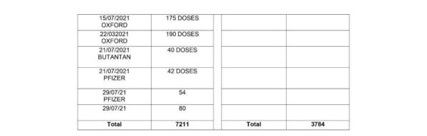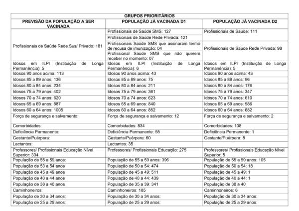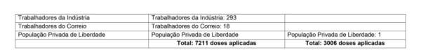 O total de doses aplicadas, 10.217, correspondem aos grupos prioritários, trabalhadores da Saúde, Educação, Forças de Segurança, de indústrias e até 35 anos ou mais. Deste total, 7.211 receberam a primeira dose e 3.006 a segunda dose do imunizante.
