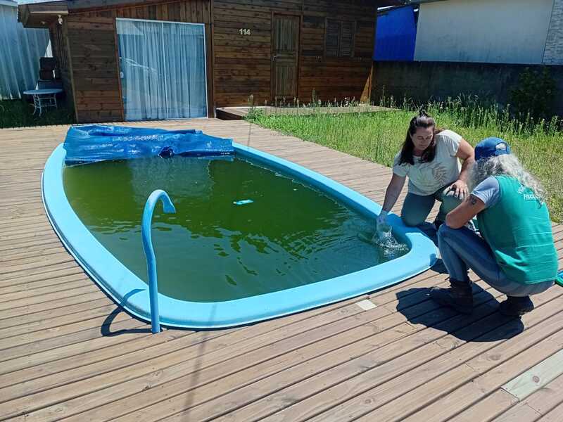 Durante a operação, os agentes vistoriaram uma residência de veraneio que apresentava condições favoráveis à proliferação do mosquito. No local, foi identificada uma piscina com água sem tratamento, situação que exigiu a presença da Polícia Militar para apoio à equipe técnica e a aplicação de larvicida, a fim de eliminar possíveis focos do vetor.