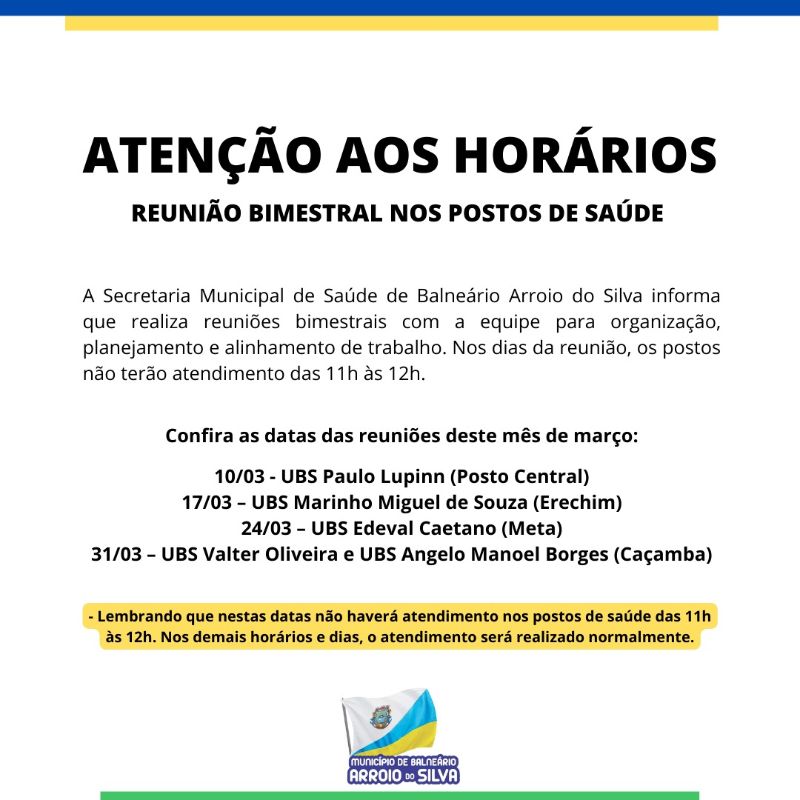 A Secretaria Municipal de Saúde de Balneário Arroio do Silva informa que realiza reuniões bimestrais com a equipe para organização, planejamento e alinhamento de trabalho. Nos dias da reunião, os postos não terão atendimento das 11h às 12h.