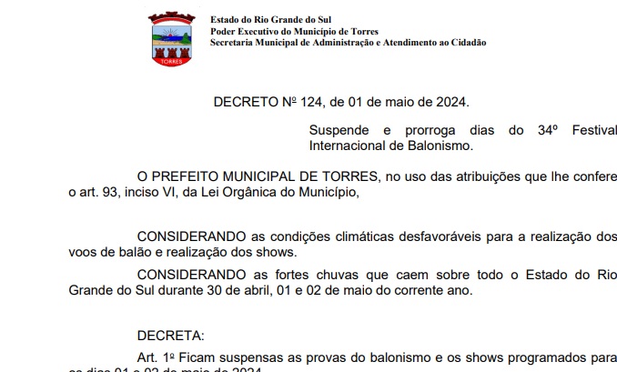 O prefeito Carlos Souza, no uso das atribuições que lhe confere, considerando as condições climáticas desfavoráveis para a realização dos voos de balão e realização dos shows. E considerando as fortes chuvas que caem sobre todo o Estado do Rio Grande do Sul. Informa através do decreto número, 124/2024 que ficam suspensas as provas do balonismo e os shows programados para os dias 01 e 02 de maio de 2024.