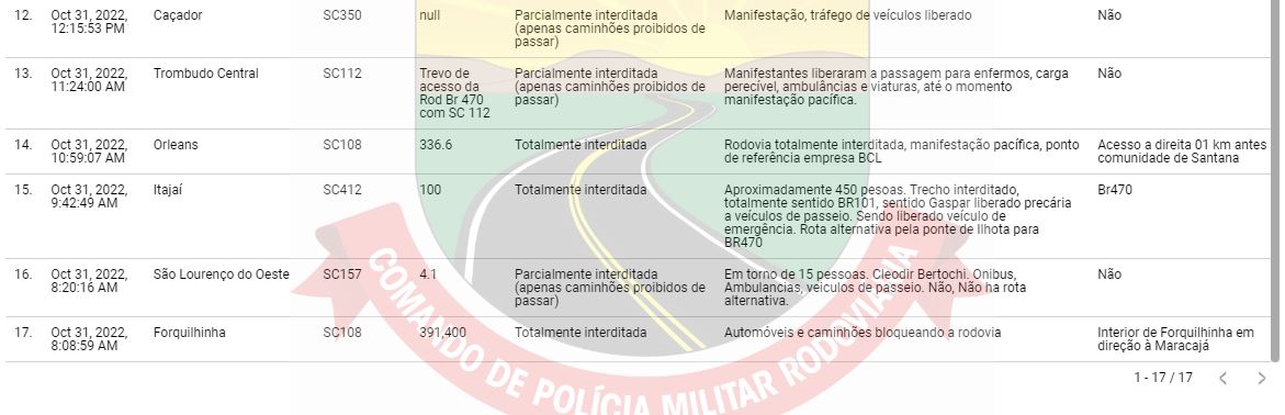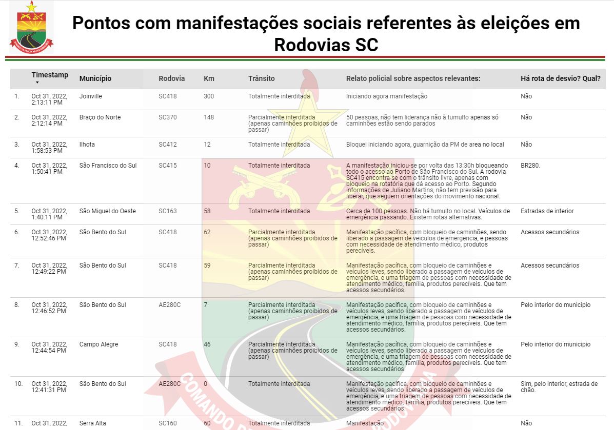 Confira os 17 pontos de bloqueio em rodovias estaduais, de acordo com a PMRv: