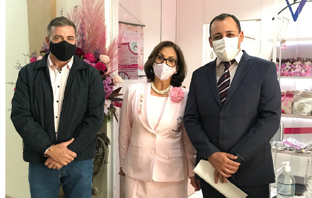 Fátima Linhares, a presidenta da Rede Feminina de Combate ao Câncer, na moldura com Lei Alexandre ex-prefeito de Forquilhinha e Saulo Pitan da empresa Performance.