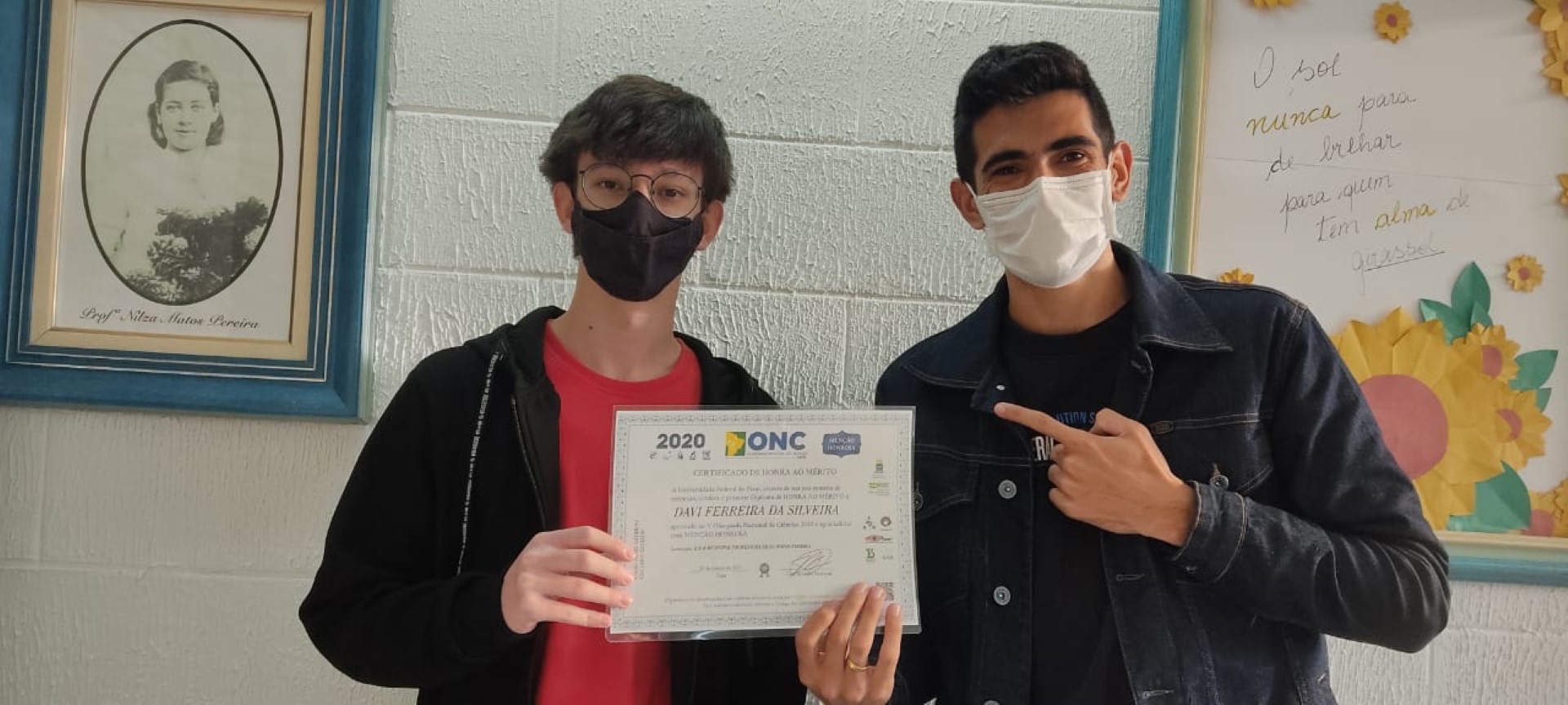 O aluno Davi, da Escola Municipal Nilza Matos Pereira de Sombrio, recebeu menção honrosa pela participação ótima na Olimpíada Nacional de Ciências. Na foto, com o professor que também se chama Davi.