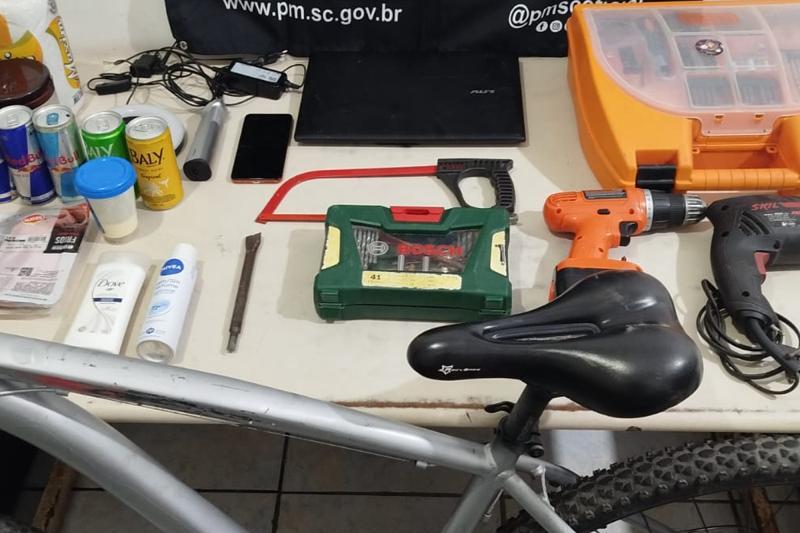 Durante a revista, os policiais encontraram diversos objetos com o suspeito, entre eles uma furadeira, parafusadeira, notebook, celular, caixa de ferramentas e uma bicicleta com sinais de adulteração, aparentemente repintada para ocultar suas características originais.