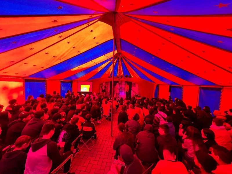 Ao longo desta segunda-feira, 2 de junho, uma tenda montada na praça da igreja matriz de Santa Rosa do Sul recebeu crianças e adolescentes das redes municipal e estadual de ensino para assistir a peça teatral Quarto de Brinquedos. Com o apoio da secretaria de Assistência Social, Conselho Tutelar e Casa da Cultura, a companhia Xebebéu trata do combate ao abuso e à exploração sexual infanto-juvenil.